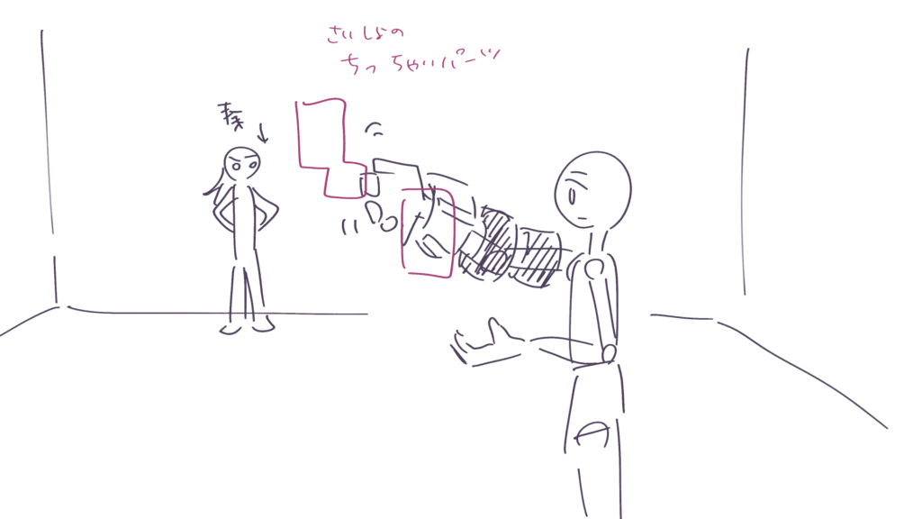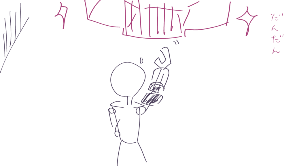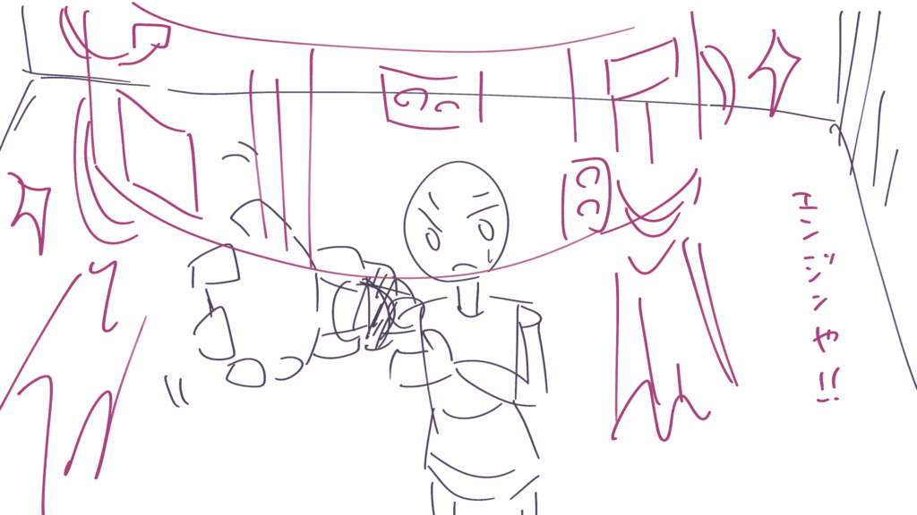 その3同様、「シーン②:宇宙航行艦」のラフコンテを描いてます。カメラワークをグルグルしながら、主人公を撮っています。